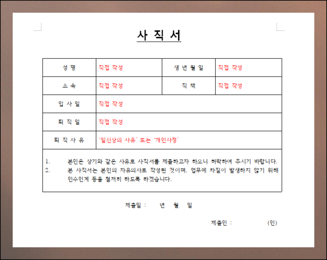 간단하게 사직서 쓰는 요령과 양식 다운로드 받는 것에 대해 알려드렸는데요. 문서를 작성하는 것도 중요하지만, 회사를 떠나는 태도가 더 중요합니다.
