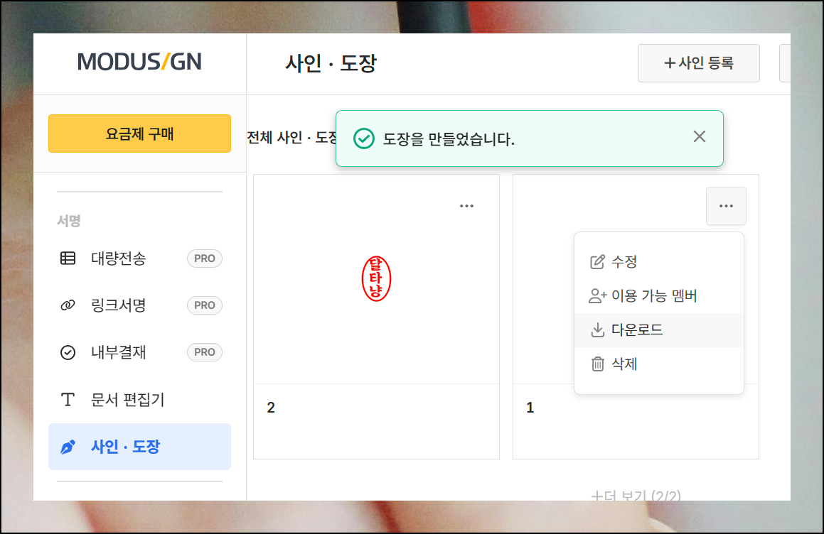 제작한 인장은 목록에서 한눈에 관리할 수 있어요. 메뉴 버튼 중 하나인 '이미지 다운로드' 버튼을 클릭하면 쉽게 저장할 수 있습니다. 다운로드 받은 파일은 문서, 프레젠테이션, 영상 등 다양한 곳에 마음껏 사용할 수 있어요.