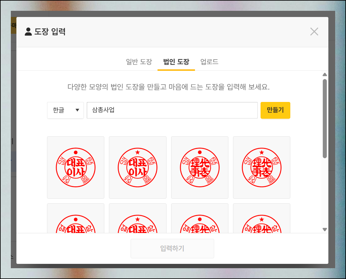 법인용도 쉽게 만들 수 있습니다. 회사 이름을 입력하고 '만들기' 버튼을 누르면 다양한 샘플이 이전 단계와 동일하게 표시돼요. 비즈니스 문서에 어울리는 전문적인 도장을 골라 활용하면 됩니다.
