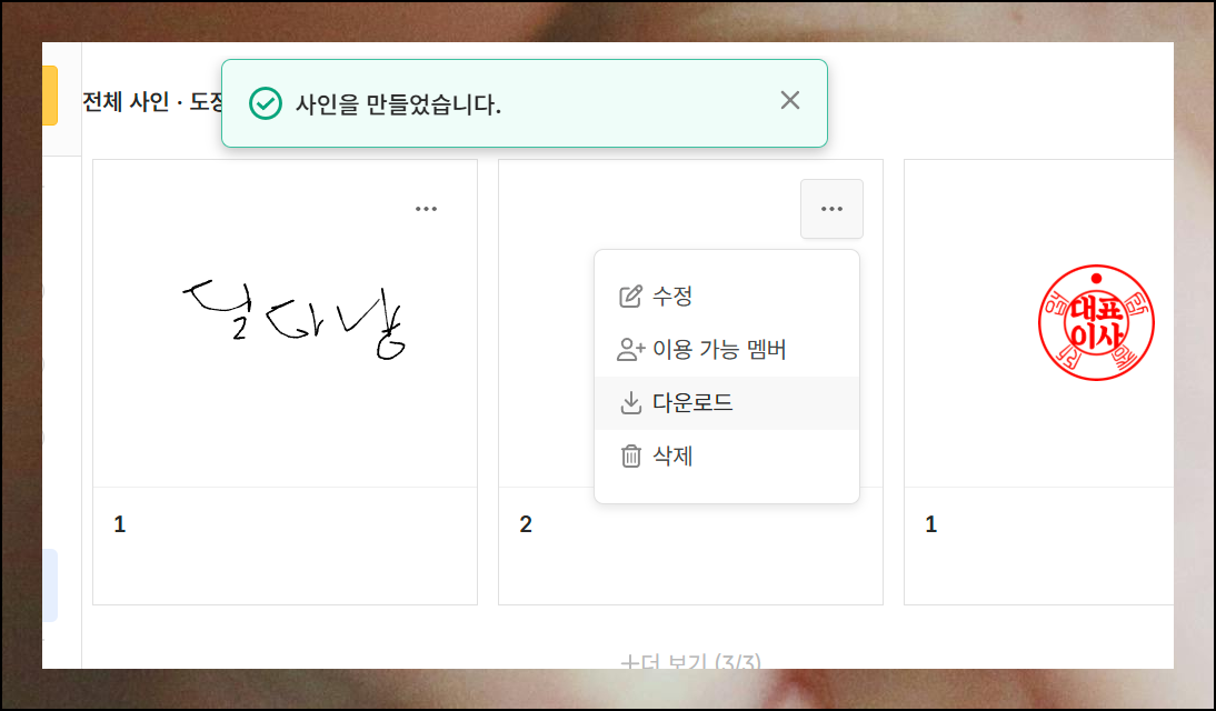 서명도 완성 후 이미지 형태로 다운로드할 수 있습니다. 프로그램을 몇 번만 사용해보면 10초 만에도 도장이나 사인을 빠르게 생성 가능해요. 자주 활용할수록 제작 속도가 더욱 빨라질 거예요.