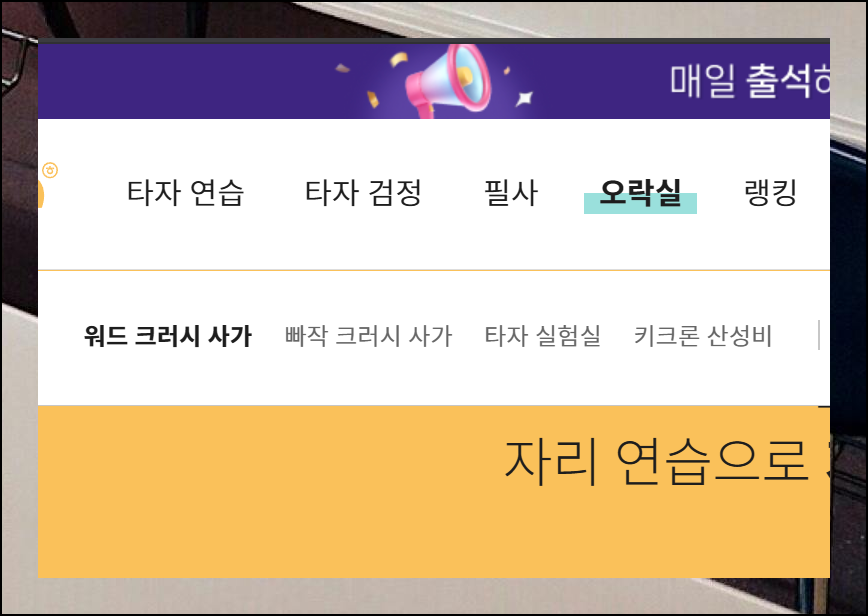 웹사이트에 접속하면 여러 메뉴가 보입니다. 그중에서도 [오락실] 메뉴가 특별히 눈에 띄어요. 워드 크러시 사가, 빠작 크러시 사가, 타자 실험실, 키크론 산성비와 같은 게임을 통해 타자 실력을 기를 수 있거든요.