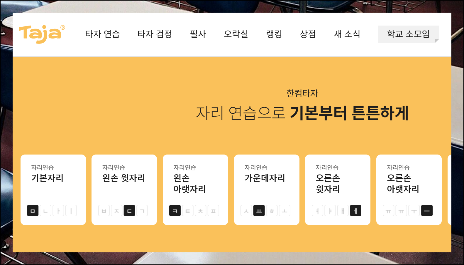 지루한 반복 학습이 아니라 게임을 즐기면서 자연스럽게 손가락 움직임이 빨라져요. 순위 시스템도 있어서 다른 이용자들과 실력을 겨룰 수 있어요. 그럼 기초 훈련을 위해 메뉴에 있는 "타자 연습"을 선택합니다.