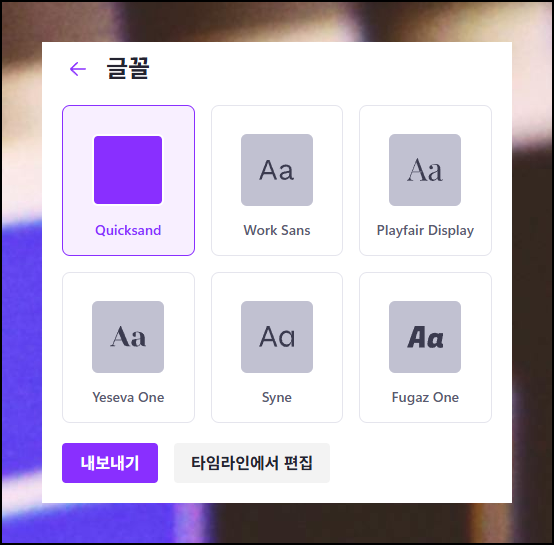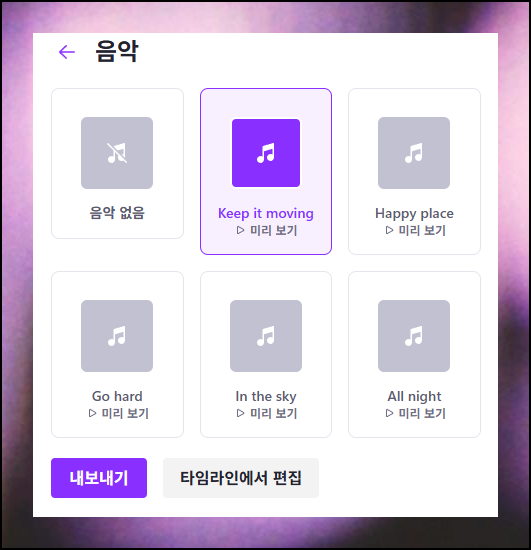 마지막으로 배경 음악과 글자 폰트를 선택하는 단계예요. 여기서 나오는 음악들은 전부 무료로 쓸 수 있는 것들이거든요. 폰트도 여러 종류가 준비되어 있으니 마음에 드는 걸 고르세요.