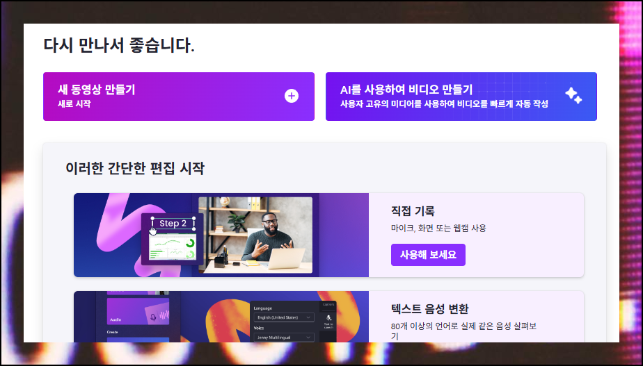 프로그램을 처음 켜면 메인 화면이 뜨는데요. 여기서 고를 수 있는 방법이 두 가지 있어요. "새 동영상 제작"이랑 "AI를 사용하여 비디오 제작"이 있습니다.