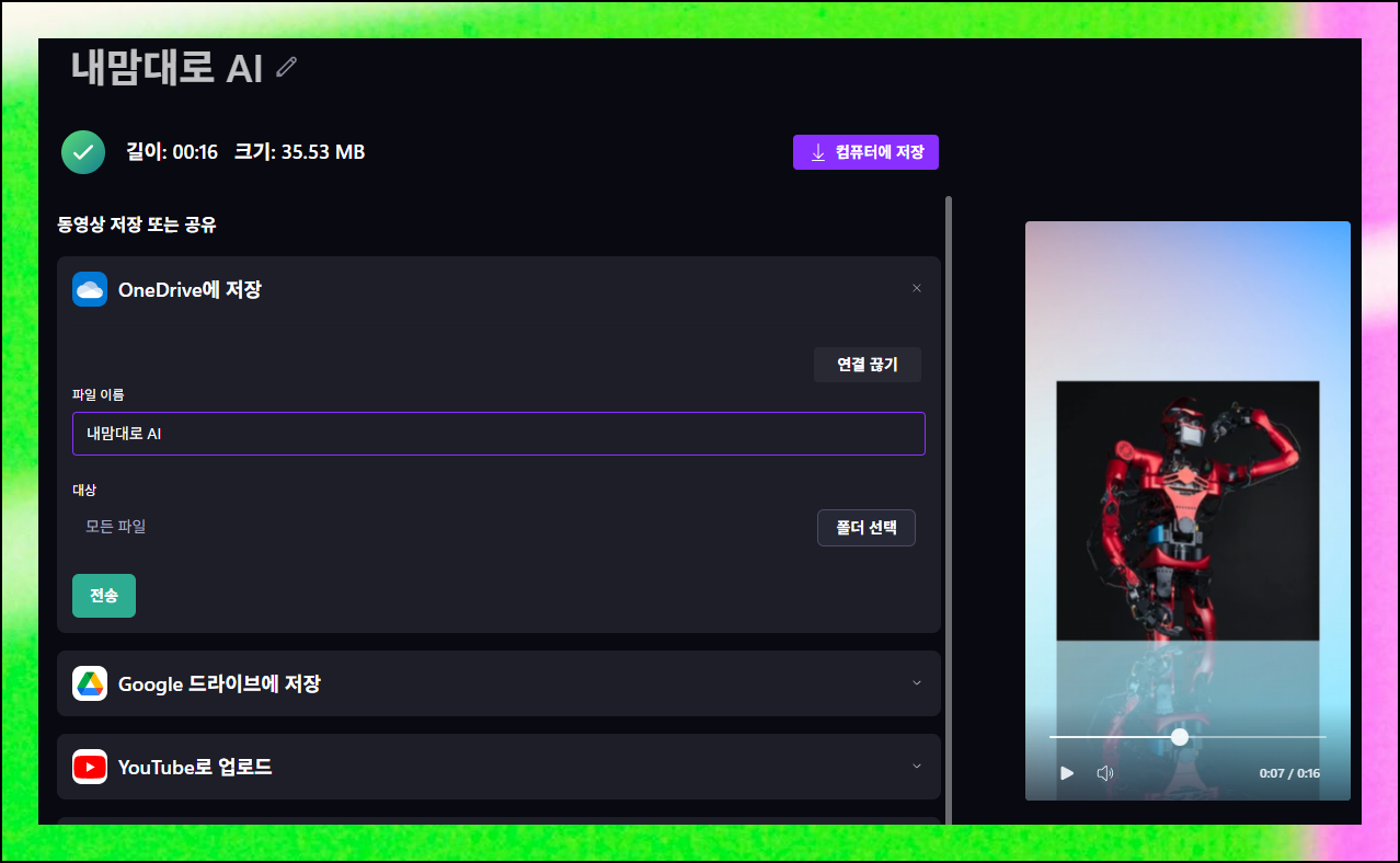 단 1분 만에 사진들이 멋진 동영상으로 변했어요. 완성된 작품은 내 컴퓨터에 저장하는 것은 물론이고, 구글 드라이브, 유튜브 같은 곳에도 바로 업로드가 가능합니다. 이런 빠른 작업이 가능한 건 AI 기술 덕분이에요.