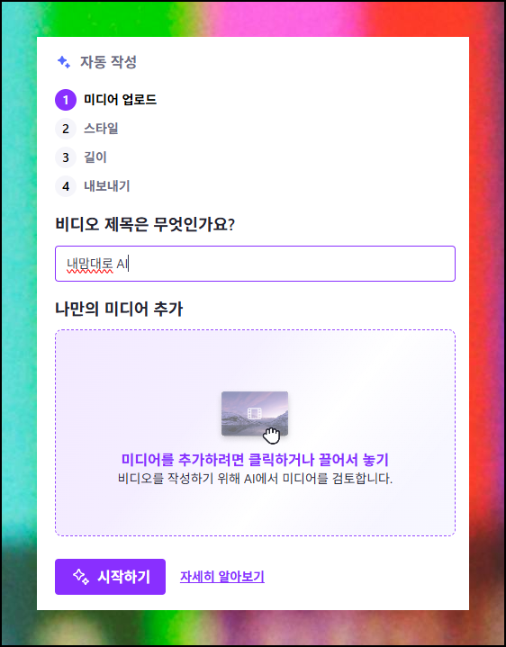 제일 먼저 할 일은 동영상 제목을 정하고 넣을 사진들을 업로드하는 거예요. 사진뿐만 아니라 직접 찍은 비디오 파일도 함께 넣을 수 있어요. 필요한 파일들을 다 올렸으면 "시작하기" 버튼을 눌러주세요.