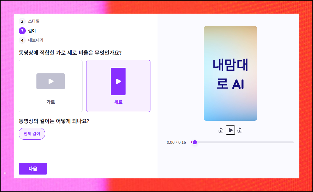 세 번째로는 비디오 길이와 화면 비율을 정해야 해요. 가로세로 비율을 먼저 선택하고, 동영상 재생 시간을 결정하면 되거든요. 제 예시는 사진이 적어서 시간이 짧게 나왔네요.