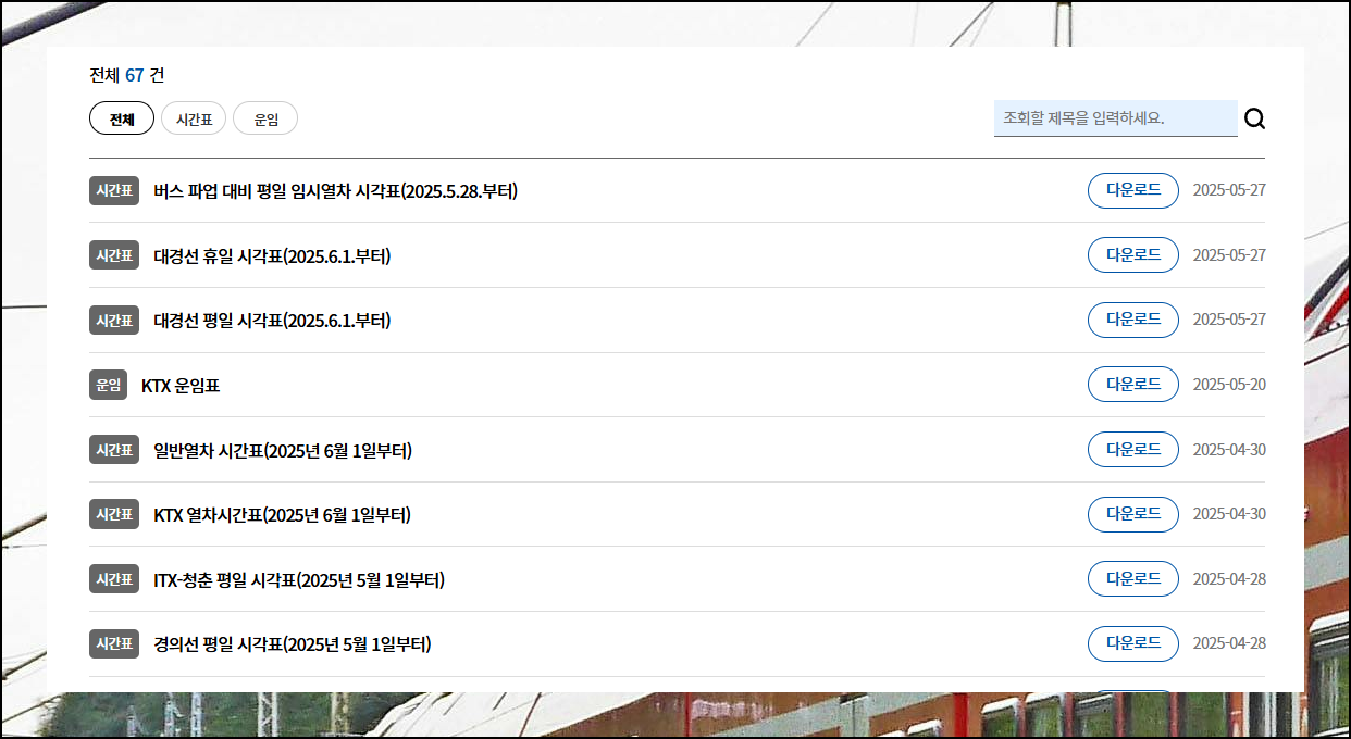 새롭게 열린 페이지에서 보면 게시판이 하나 나타납니다. 여기에서 기차시간표 또는 운임표를 찾아 선택해 보세요. 여기서 코레일에서 운영하는 기차에 대한 정보를 확인할 수 있어요.