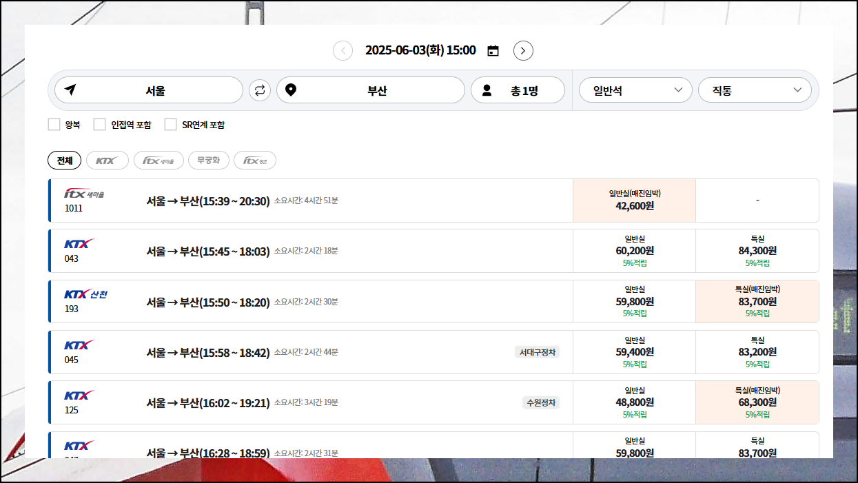 온라인을 통해 시간표부터 요금 정보까지 모든 데이터를 실시간으로 조회할 수 있습니다. 무엇보다 좌석 현황과 할인 혜택까지 동시에 비교해보실 수 있어 가장 합리적인 선택이 가능해집니다. 이제 스마트하게 서울역 기차를 예매해보세요.
