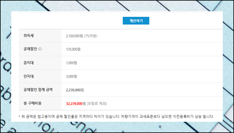 실제 예시로 3천만원 차량을 입력해보면 취등록세가 210만원으로 나타납니다. 이 금액 안에는 취득세와 등록세가 모두 포함되어 있어요.