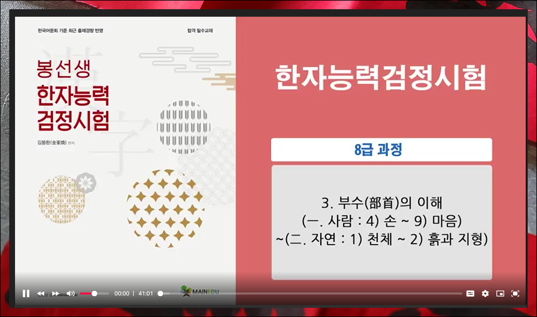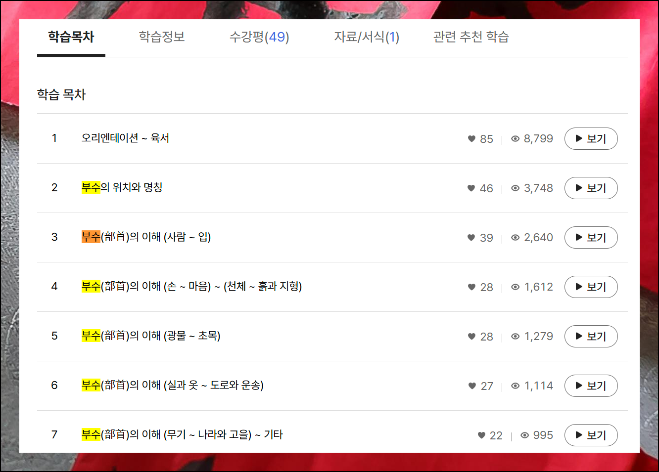 한자 부수 214개를 제대로 익히고 싶다면 여기에 관련된 동영상 강의를 들어보세요. 수준 높은 강의를 무료로 들을 수 있습니다. 처음부터 끝까지 비용 부담 없이 들을 수 있어요.