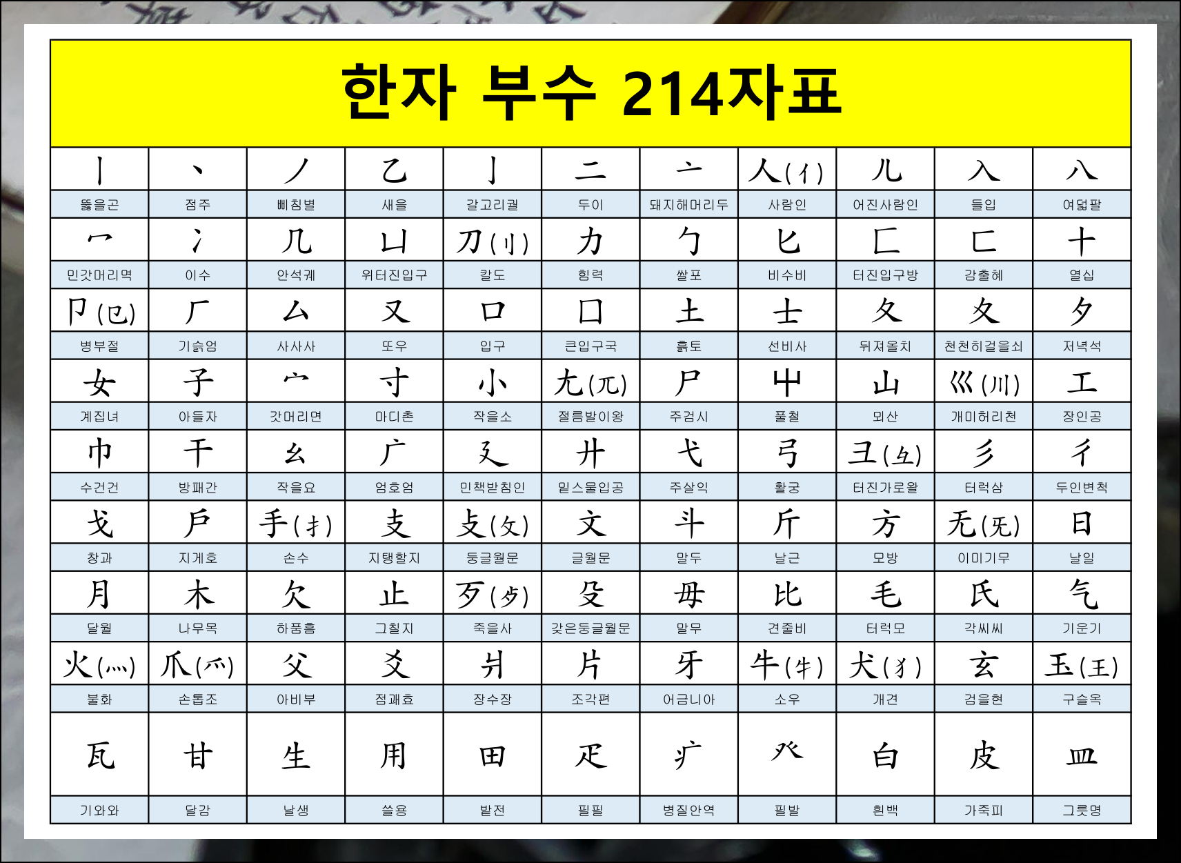부수를 알면 복잡해 보이는 한자도 의미 있는 구성 요소로 나누어 분석할 수 있거든요. 이번 시간에는 다운로드 받을 수 있는 214자표와 함께 무료 동영상 강의, 상세한 해설을 이용할 수 있습니다.