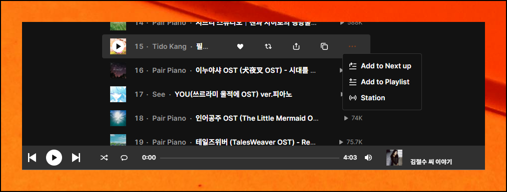 비슷한 장르의 여러 mp3 파일들을 묶어 놓은 "모음집"이라고 생각하시면 돼요. 이걸 클릭하면 오랜 시간 연속으로 음악 감상을 할 수 있습니다.