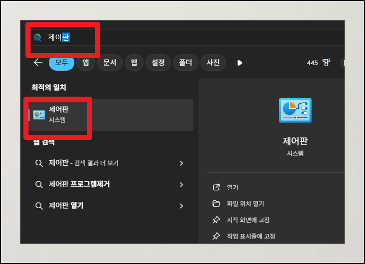 키보드에서 시작 버튼을 누르고 "제어판"이라고 타이핑해보세요. 검색 결과에 제어판이 바로 나타날 거예요. 찾아낸 제어판 앱을 더블클릭해서 열어주세요.