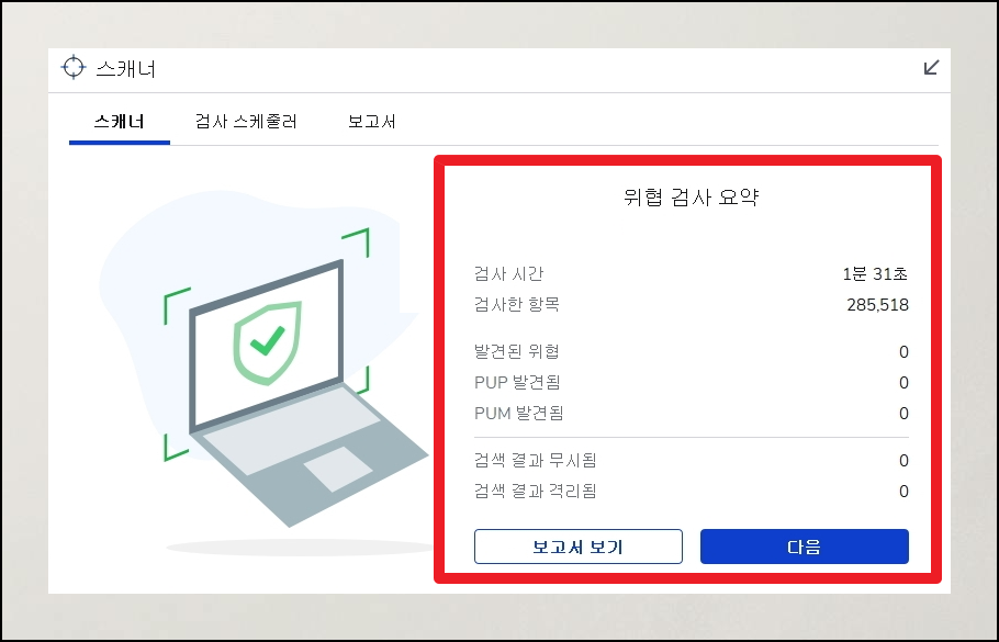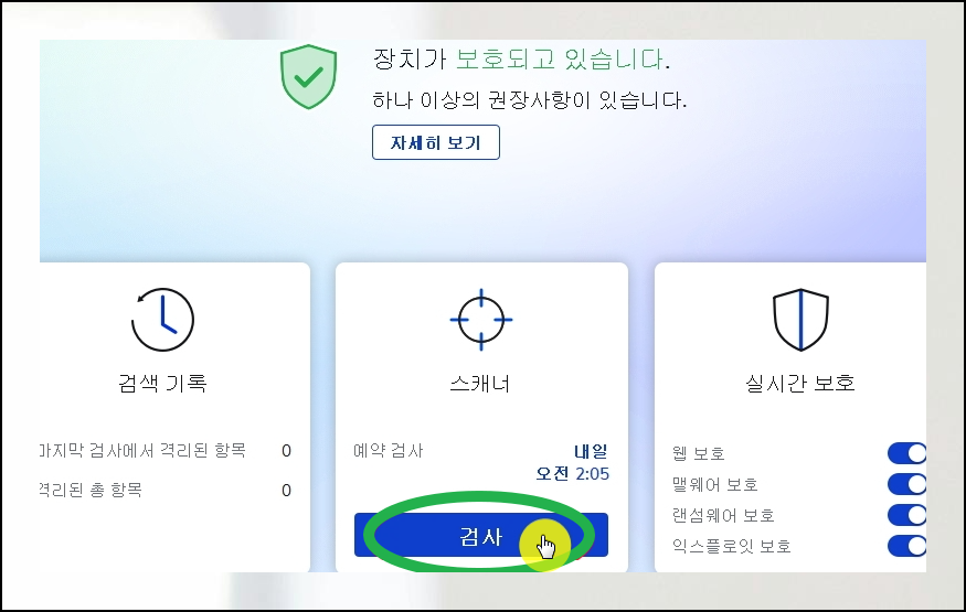 이 툴의 사용법은 놀라울 정도로 직관적입니다. 애플리케이션 메인 화면의 중앙 하단 부분에 위치한 스캐너 섹션에서 검사라고 표시된 버튼을 클릭해주시면 됩니다.