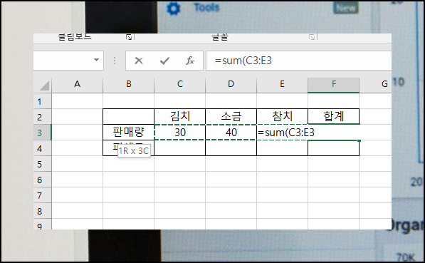 비율 계산의 첫 번째 단계는 전체 합계를 구하는 것입니다. 김치, 소금, 참치의 판매량을 모두 더한 총 판매량을 알아야 해요. 이런 상황에서 스프레드시트의 SUM 함수가 매우 유용합니다. 총 판매량을 표시하고 싶은 셀을 선택한 다음 "SUM("이라고 입력해보세요. 그 다음에는 마우스를 사용해서 첫 번째 상품부터 마지막 상품까지 드래그하면 "C3:E3" 같은 셀 범위가 자동으로 입력돼요. 마지막에 닫는 괄호 ")"를 추가하고 엔터 키를 눌러서 계산을 완료하세요.