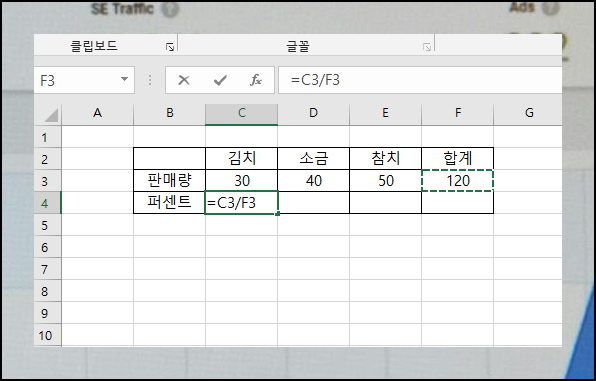 결과가 나오면 엑셀 프로그램의 놀라운 기능을 확인해볼 수 있어요. 예를 들어 김치 판매량을 30개에서 40개로 수정해보세요. 그러면 총 판매량이 자동으로 120개에서 130개로 업데이트됩니다. 이것이 바로 엑셀 프로그램의 장점이에요. 이제 실제 퍼센트 구하기를 시작해봅시다. 김치의 비율을 계산할 셀을 선택하고 등호 기호 "="를 입력하세요. 그 다음 김치 판매량이 있는 셀을 마우스로 클릭하고 나누기 기호 "/"를 입력한 후 총 판매량 셀을 클릭합니다. 엔터 키를 누르면 김치의 비율이 계산돼요.