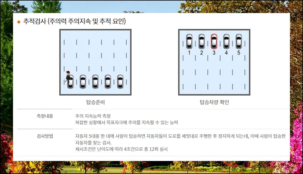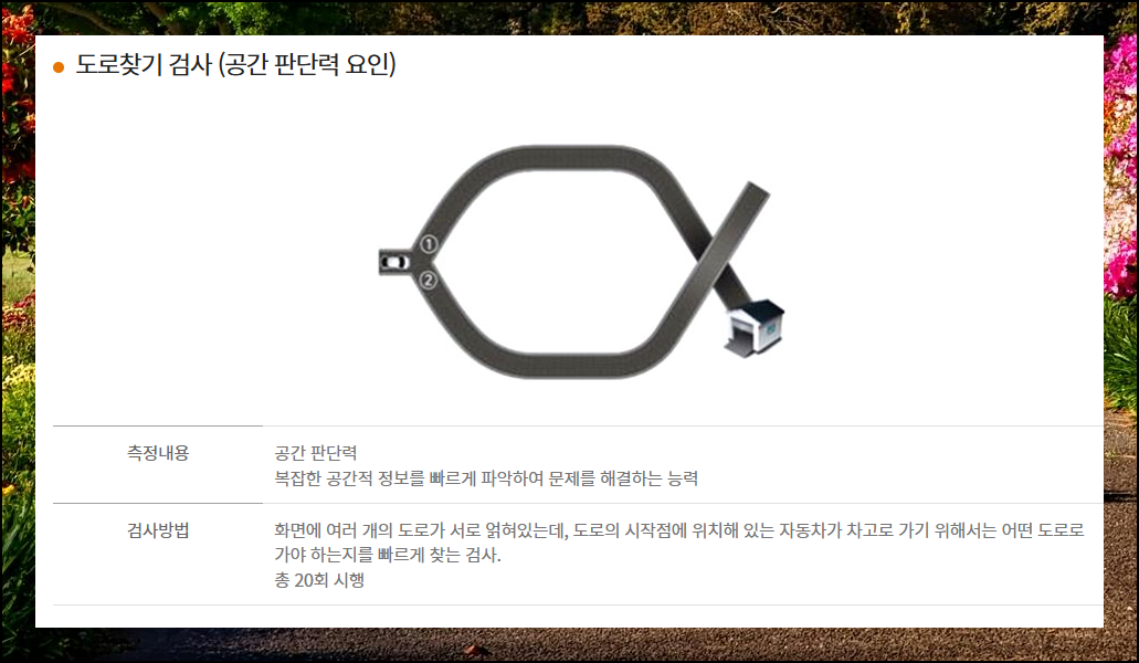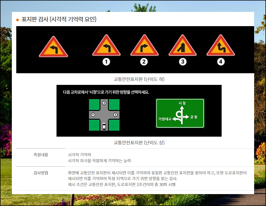 나머지 네 가지 항목은 실제 도로 상황에서 필요한 고령운전자의 판단력과 기억력을 측정하는 내용들이에요. 복잡한 도로에서 목적지까지 가는 길을 정확히 찾을 수 있는지 확인하고, 도로 표시판에 적힌 정보를 얼마나 잘 기억하는지도 살펴봅니다. 이 모든 평가는 나이와 상관없이 모든 운전자가 안전하게 차량을 운행하기 위해 꼭 필요한 기본 능력들을 확인하는 과정이라고 보시면 됩니다.