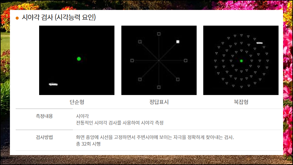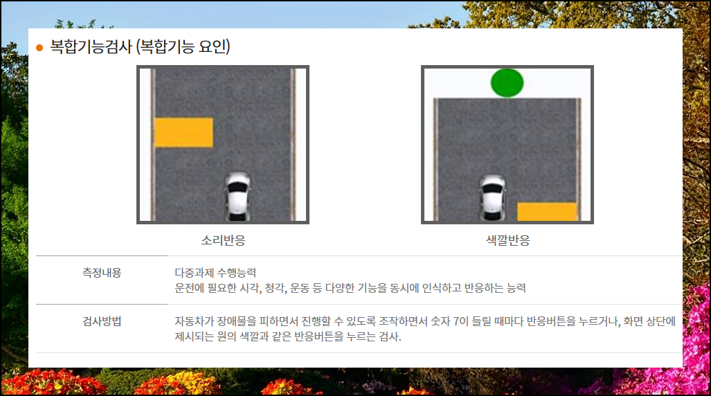 자격유지검사 신청 방법을 소개하기 전에 실제 시험에서 어떤 능력들을 확인하는지 먼저 설명 드릴게요. 미리 알고 가시면 당일 더 좋은 결과를 얻으실 수 있어요. 총 7개 항목 중 첫 번째 세 가지는 운전의 기본이 되는 능력들입니다. 눈으로 볼 수 있는 범위가 얼마나 넓은지 시야각을 측정하고요, 신호등 색깔이 바뀔 때 얼마나 빠르게 인지하고 반응하는지도 확인합니다.