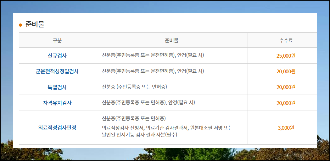 시험 종류에 따라서 가져가야 할 준비물이 조금씩 다를 수 있어요. 고령운전자 자격유지검사를 받으실 때는 평상시에 안경이나 콘택트렌즈를 착용하고 계신다면 반드시 가져가셔야 하고요, 신분을 확인할 수 있는 신분증과 수수료도 준비해주세요. 의료적성검사판정을 받는 경우라면 준비해야 할 서류가 더 많아지지만 비용은 3,000원으로 부담 없는 금액이니 참고하시면 됩니다.