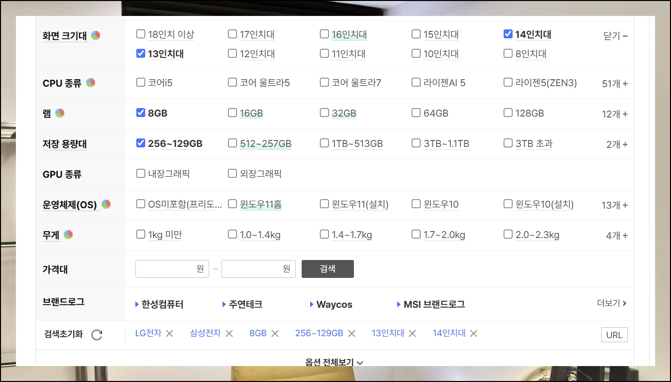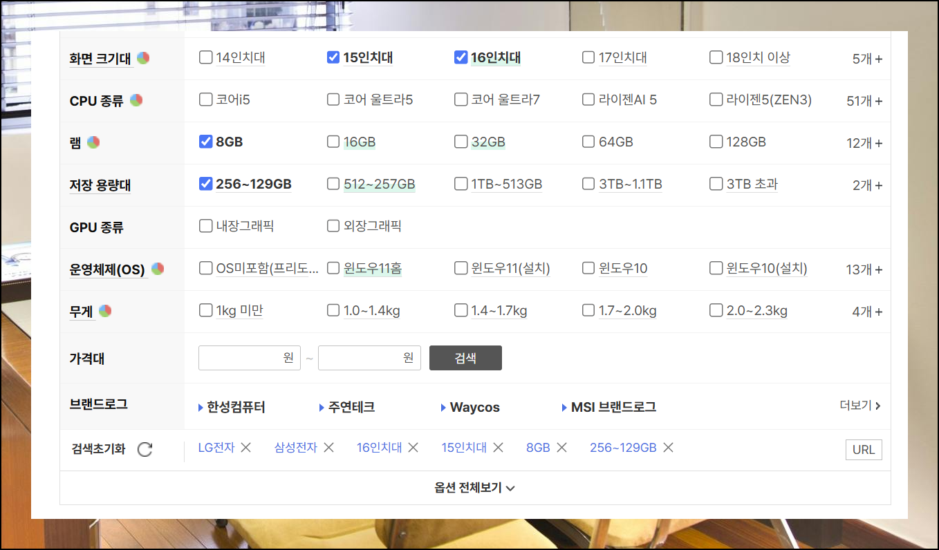 이제 다나와 사이트에서 검색 조건을 본격적으로 설정해 보겠습니다. 메모리 용량은 최소 8GB로 설정하는 것을 추천해요. 이 정도 용량이면 여러 개의 인터넷 창을 동시에 열어도 컴퓨터가 느려지지 않습니다. SSD 저장공간도 120GB 이상으로 선택하시면 각종 프로그램을 빠른 속도로 실행할 수 있어요.