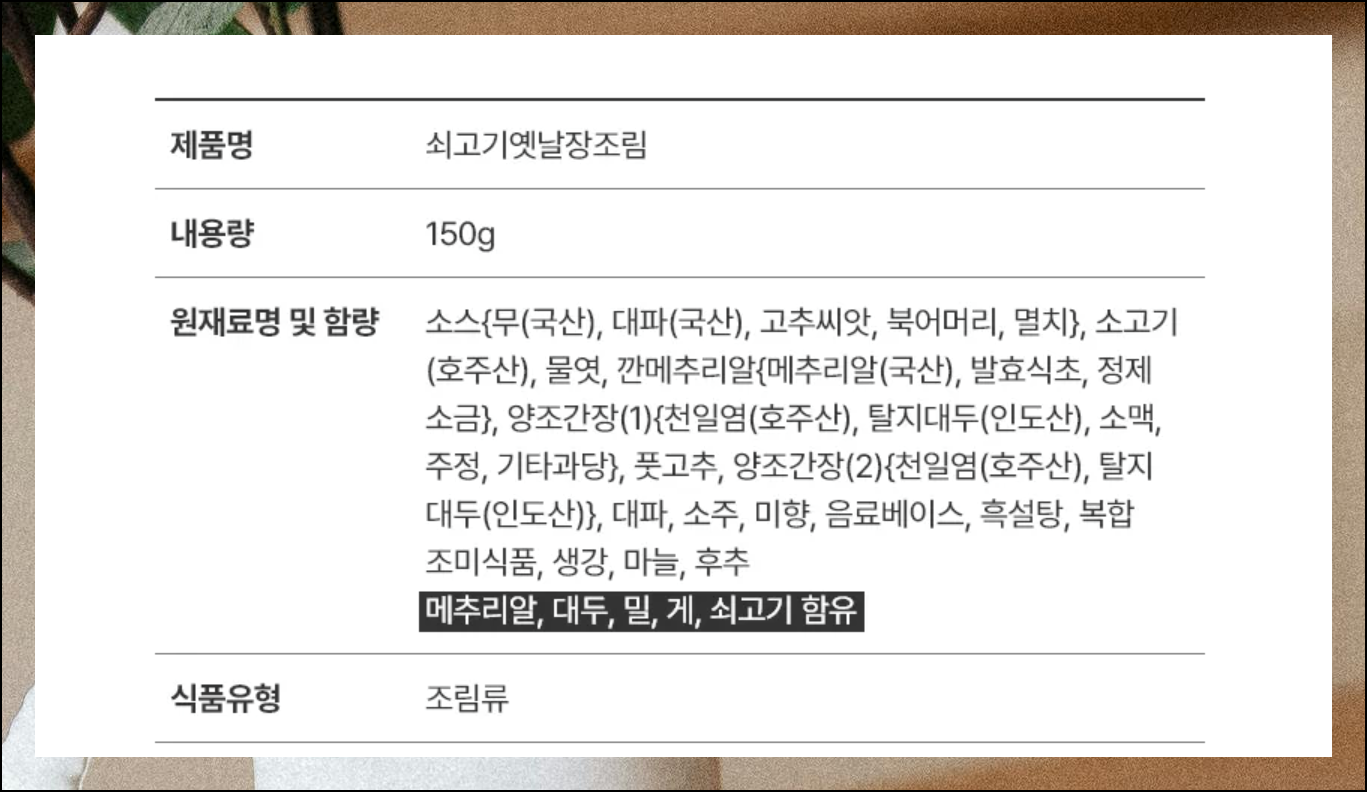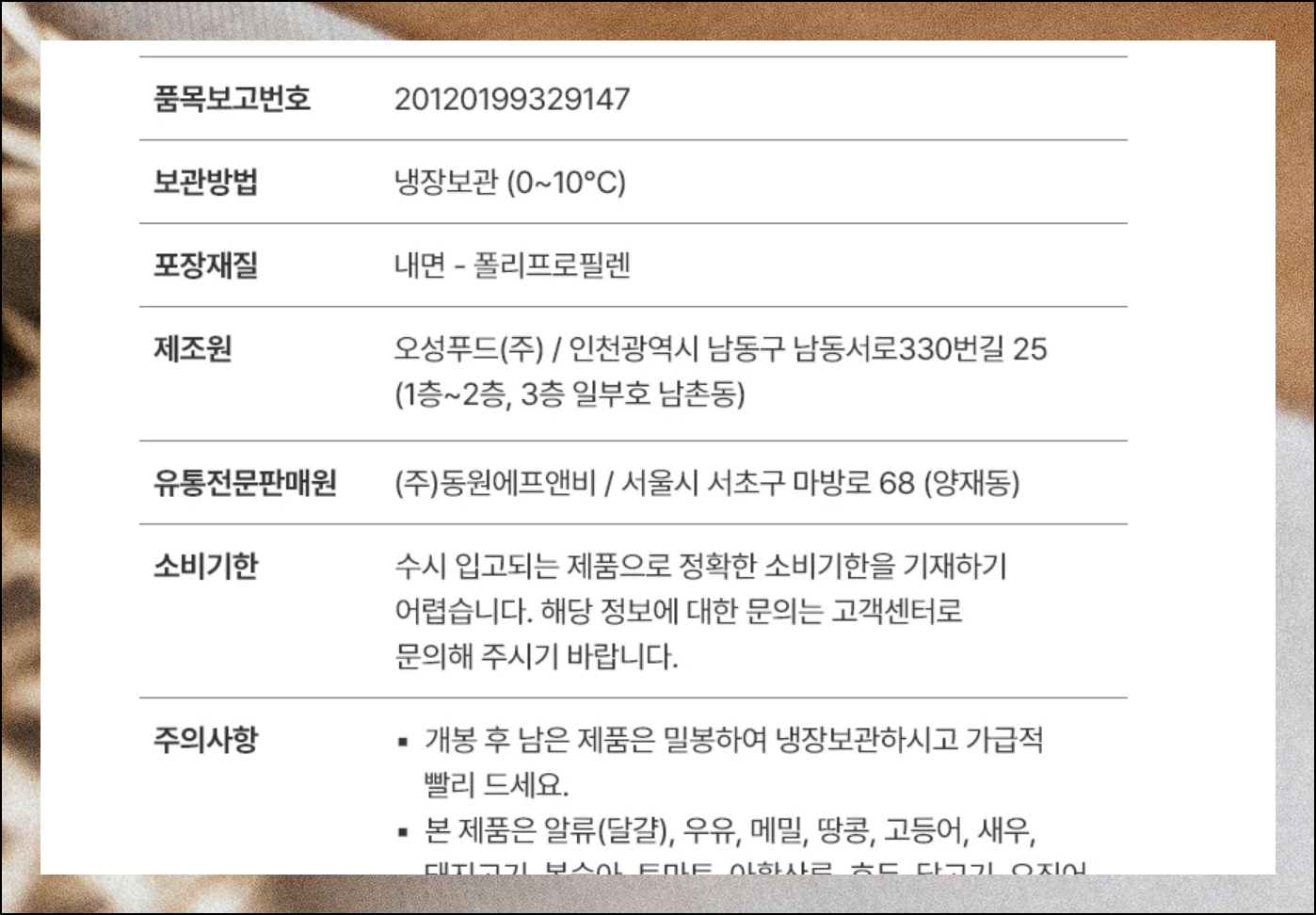 여기 있는 음식을 선택하면 제품 정보를 확인할 수 있는데요. 제품정보고시를 보시면 원재료를 알 수 있어요. 레시피는 아니지만, 밑반찬을 준비할 때 어떤 재료를 사용했는지 참고하기 좋아요. 집에서 직접 만들 때도 도움이 되죠.