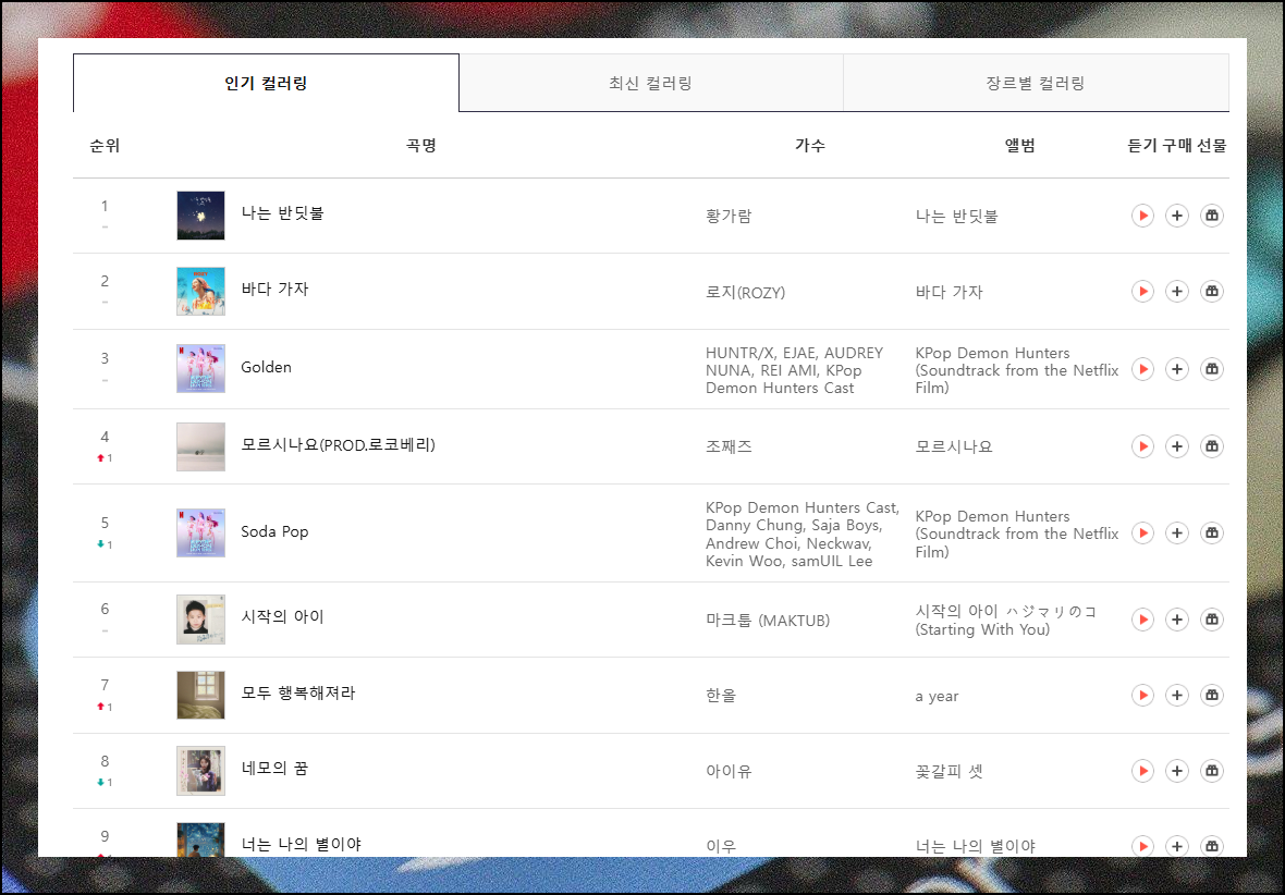특정 곡을 컬러링으로 설정하고 싶다면 검색 기능을 적극 활용해보세요. 곡명뿐만 아니라 앨범명이나 아티스트명으로도 검색이 가능합니다. 검색창 아래쪽에는 인기곡, 최신곡, 장르별 순위 정보가 체계적으로 정리되어 있는데요. 개인적으로는 장르별 분류를 통해 탐색하는 방식을 추천 드려요.