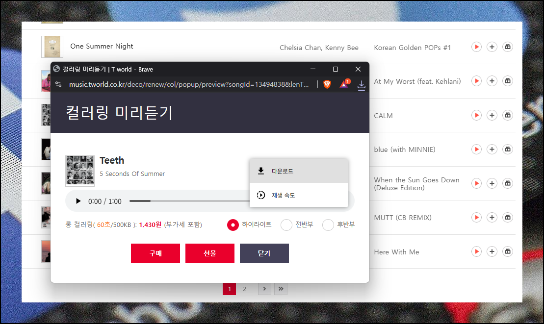 목록 오른쪽 끝에 위치한 재생 버튼을 클릭해보세요. 실제로 추천을 받은 컬러링 노래를 구매하거나 핸드폰에 적용하기 전에 미리 들어볼 수 있는 편리한 기능입니다. 티월드 플레이어의 경우 재생바 맨 우측에 있는 버튼을 클릭하면 다운로드 옵션이 활성화되는데요. 다운로드 후 개인 음악 재생 프로그램으로 재생해보니 해당 노래를 들을 수 있었습니다.