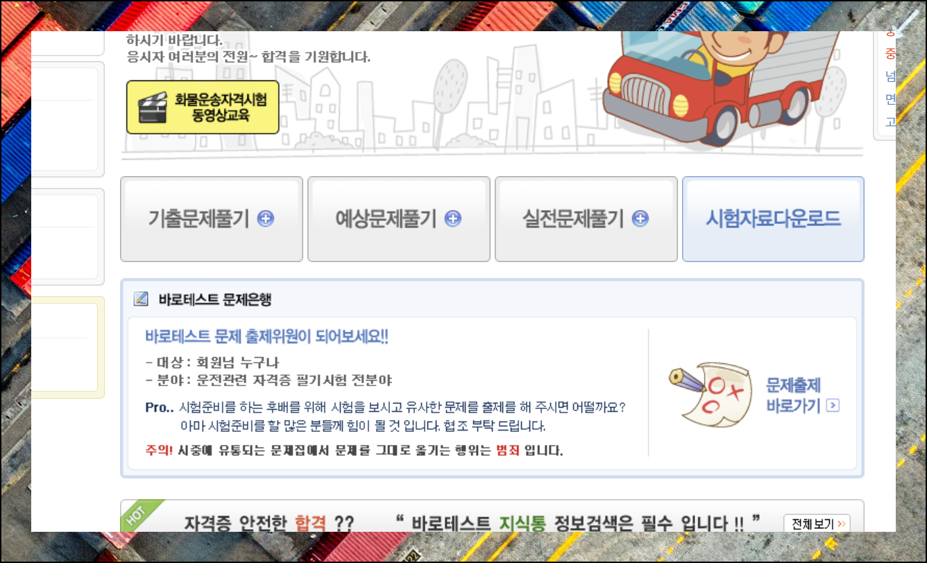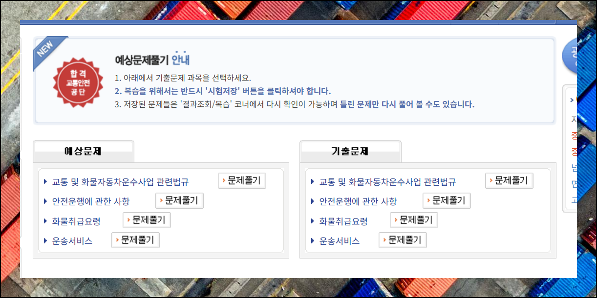 화물운송 자격시험을 준비할 때 필요한 기출문제는 물론이고, 예상 및 실전문제도 이곳에서 풀 수 있어요. 여기서도 시험자료를 무료로 제공하고 있기는 한데요. 앞서 첨부한 한국교통안전공단 자료가 더 최신 버전이니까 함께 활용하시면 좋겠습니다.