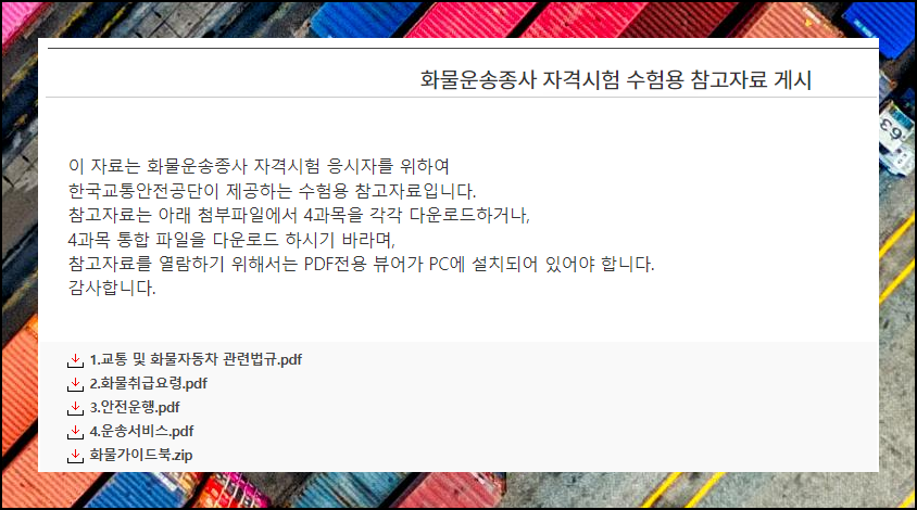 기출문제를 풀기 전에 수험용자료를 다운로드 받아 보세요. 한국교통안전공단 사이트에서는 화물운송 자격시험을 준비하는 분들을 위해 유용한 수험용 참고자료를 무료로 제공하고 있어요. 이 시험에는 총 4가지 과목이 포함되어 있습니다. 교통 및 화물 관련 법규, 화물취급요령, 안전운행요령, 운송서비스로 구성되어 있어요. 모든 자료는 PDF 파일 형태로 다운로드 받을 수 있습니다.
