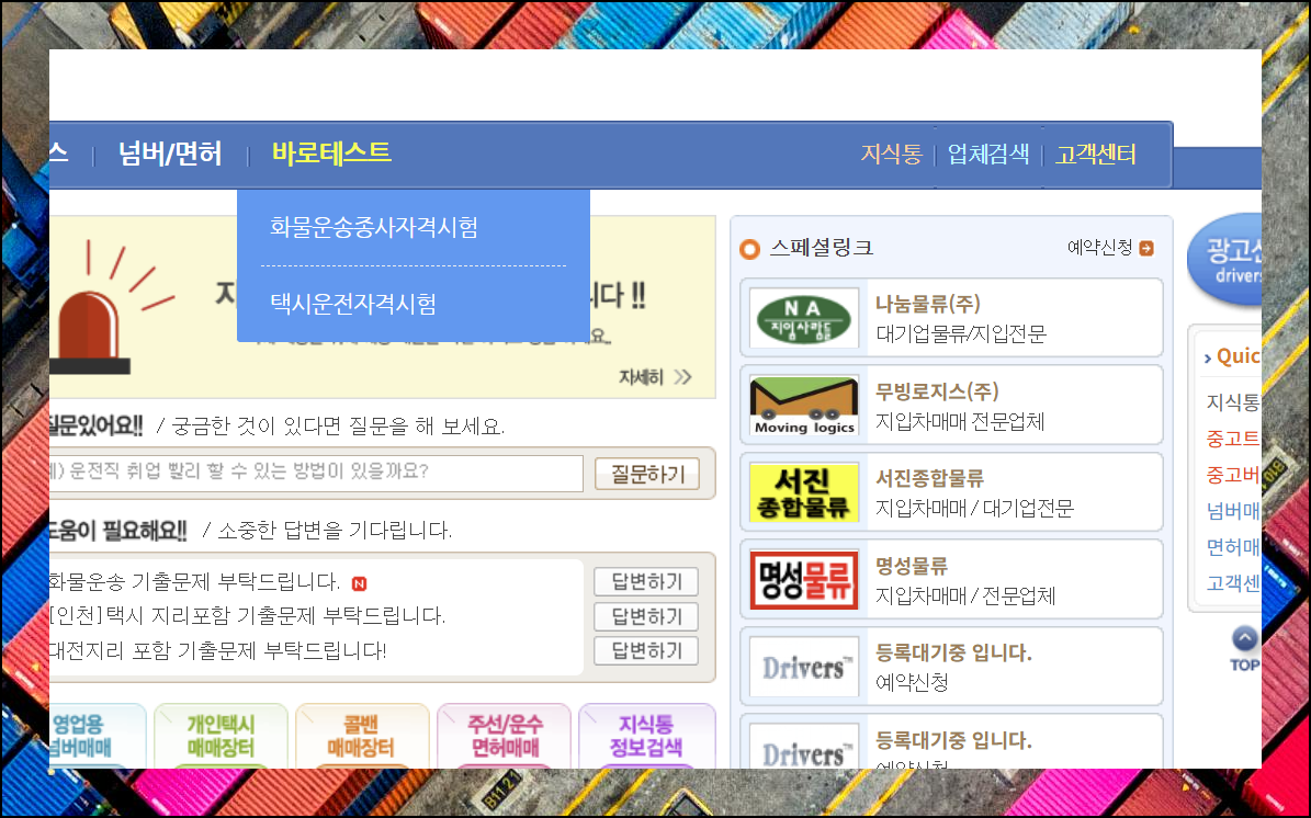 홈페이지에 접속해서 메뉴에 있는 "바로테스트" 메뉴를 선택해 보세요. 그럼 화물운송 종사자격시험과 택시운전 자격시험 이렇게 2가지 메뉴가 나타나요. 우리가 필요한 것은 첫번째 메뉴인 화물차량 종사자격시험이니까 이것을 선택해 주세요. 메뉴 구성이 직관적이라 헷갈릴 일은 없을 거예요.