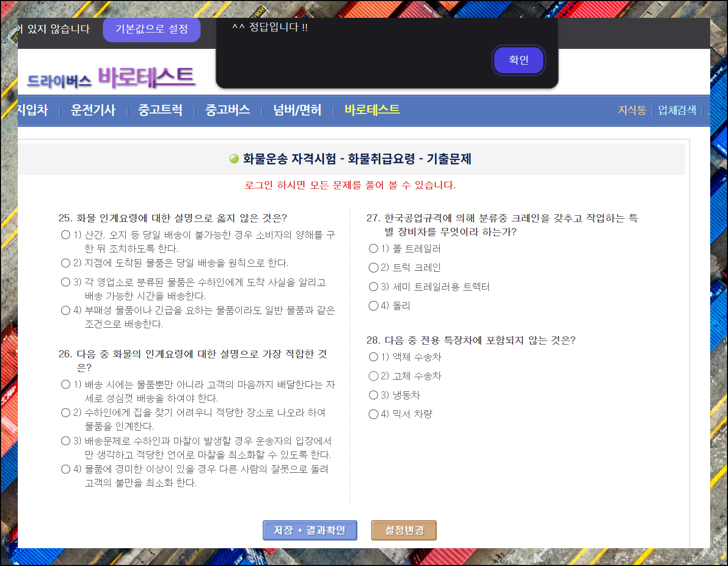 화물 인계 요령, 전용 특장차 등 실무에 유용한 내용이 많네요. 화물운송 무료 기출문제를 풀면서 답이라고 생각하는 선택지를 마우스로 클릭해 보세요. 그럼 바로 정답 여부를 확인할 수 있는 알림창이 나타납니다.