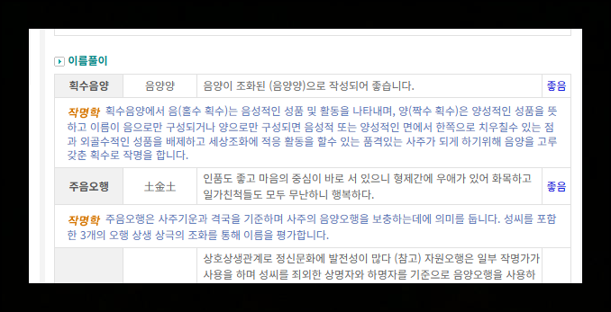 사람의 이름에는 사용을 피해야 하는 한자가 존재합니다. 처음 작명을 진행할 때 이런 부분을 고려해야 하는데, 사주닷컴의 이름풀이 서비스를 활용하면 불용한자 사용 여부를 간편하게 체크할 수 있어요. 성명학에 따른 부모 성명과의 조화 정도도 함께 확인 가능합니다. 주역학을 기반으로 한 해석도 제공되니 종합적인 분석 자료로 활용하시길 바라요.