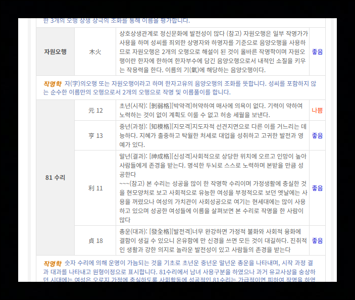 사주 관련 풀이가 완료되면 성명학에 속하는 획수풀이와 자원오행, 81수리 부분을 확인할 수 있어요. 상세한 풀이 내용을 통해 초년, 중년, 말년 각 시기에 어떤 운을 갖게 되는지 알 수 있습니다. 각 시기별로 "좋음" 또는 "나쁨"으로 간단하게 표시된 평가 결과도 있어서 복잡한 내용을 쉽게 이해할 수 있어요.
