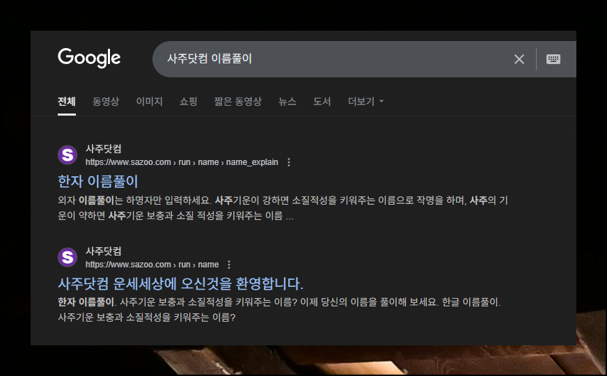 성명학 획수풀이와 사주 분석까지 모두 가능한 사이트가 바로 사주닷컴이에요. 이곳에서 제공하는 서비스를 활용하면 불용한자 여부, 이름이 사주에 미치는 다양한 영향력, 자원오행, 81수리 등 폭넓은 정보를 한번에 확인할 수 있습니다. "사주닷컴 이름풀이"로 검색하면 별도의 메뉴 선택 없이 바로 해당 서비스 페이지로 이동할 수 있거든요.