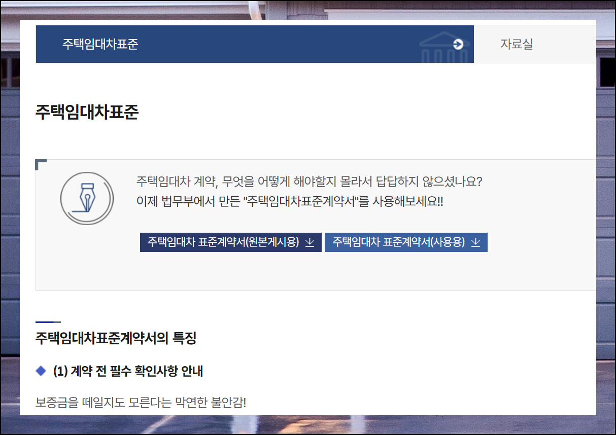 부동산 주택임대차 표준 관련 페이지가 화면에 나타났어요. 여기서 주택임대차 표준계약서 사용용이라고 표시된 버튼을 눌러보세요. 그러면 무료양식을 받을 수 있습니다.
