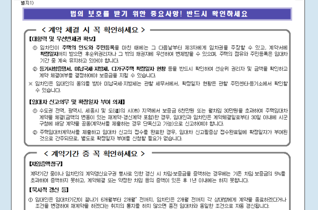 서식 파일 내용을 살펴보면 부동산 임대차 본문 뒤쪽에 확인해야 할 중요 사항들이 기재되어 있어요. 법적 보호를 제대로 받기 위해 반드시 확인해야 한다고 명시되어 있는데요. 안전한 작성을 위해서는 해당 부분을 꼼꼼히 읽어보시는 것이 중요합니다.
