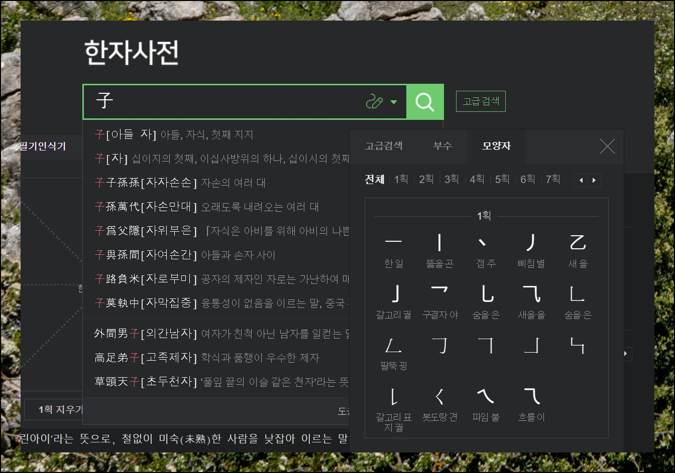 문자를 선택하고 나면 관련된 단어나 성어가 자동으로 나타나요. 그 목록에서 원하는 항목을 고르시면 됩니다. 손으로 그리는 게 어려운 분들을 위해 고급 검색 기능도 준비되어 있어요. 이 기능을 활용하면 예전 옥편처럼 음이나 획수로도 검색할 수 있어서 무료한문 도구로서 편리합니다.