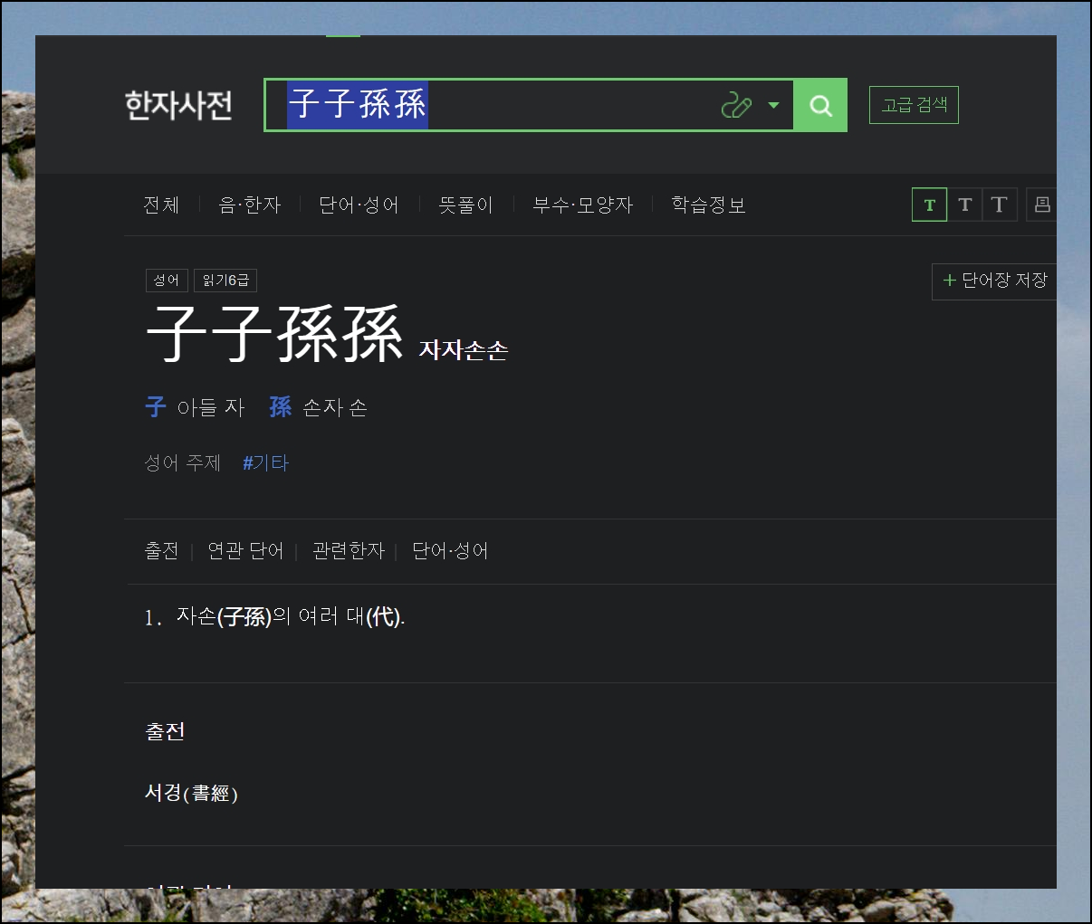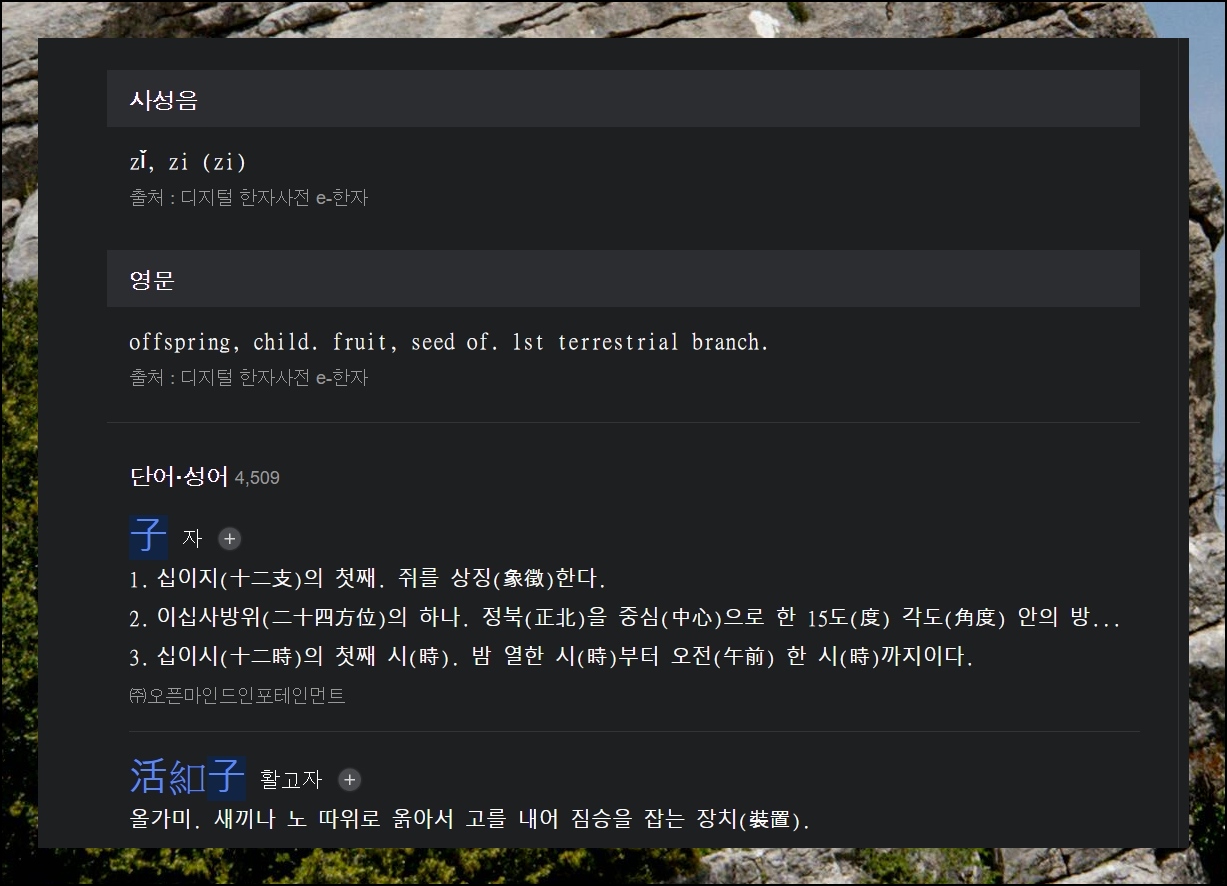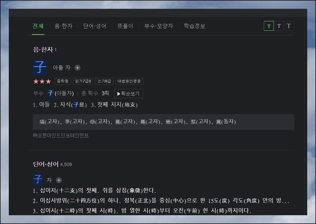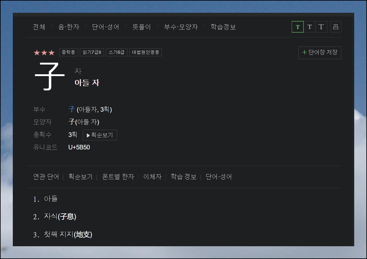 선택한 글자에 대한 사성음과 영어 표기도 확인할 수 있어요. 그리고 관련된 단어와 성어가 얼마나 많은지도 알 수 있습니다. "아들 자"의 경우 무려 4,509개의 관련 단어 및 고사성어가 있더라고요. 이 중 아무거나 선택하면 그 단어나 성어의 의미와 구성 요소들의 음과 뜻을 모두 확인 가능해요.