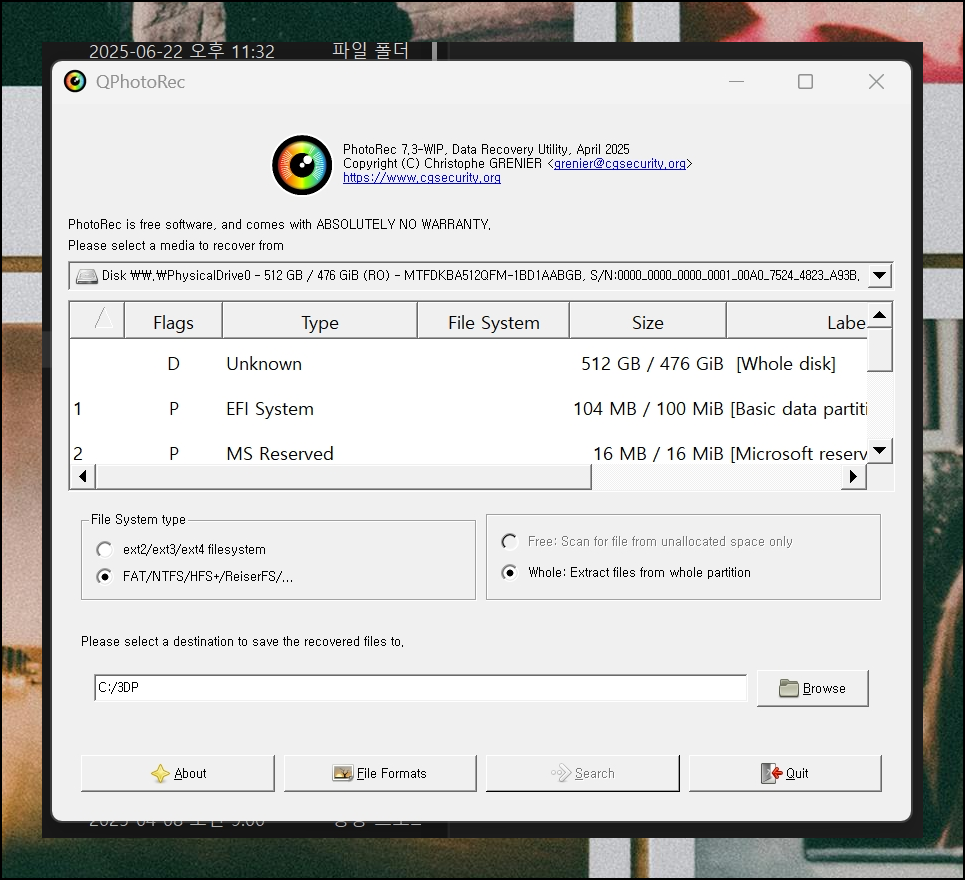 받아진 파일은 zip 형태로 압축되어 있습니다. 컴퓨터에 설치된 압축 해제 앱을 사용해서 풀어주세요. 압축을 해제하면 여러 실행 파일들이 보이는데, 이 중에서 qphotorec_win을 찾아서 더블클릭해 주시면 됩니다.