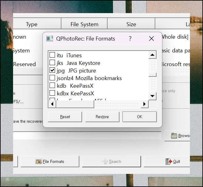 복원하려는 사진 파일의 종류를 미리 설정해두는 단계입니다. 이 과정을 생략하면 컴퓨터에서 예전에 제거된 모든 종류의 데이터를 복원하려고 시도해요. File Formats 버튼을 눌러서 jpg, png 같은 이미지 확장자만 선택해두시면 훨씬 효율적으로 작업할 수 있어요.