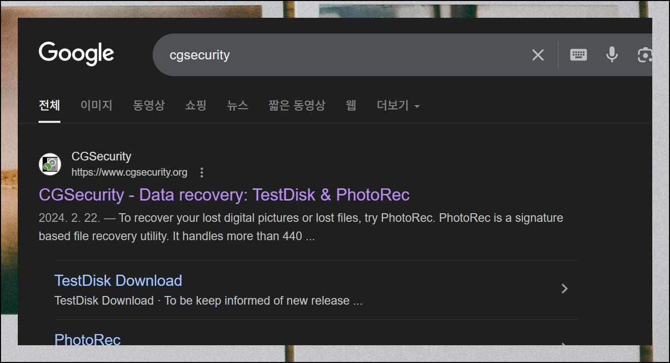해외 제작사에서 개발한 복원 도구를 사용할 예정입니다. 홈페이지와 앱이 모두 영어로 제공되지만, 걱정하지 마세요. 실제 사용법은 매우쉬워서 쉽게 이용할 수 있어요. 제가 알려드리는 방법을 따라 진행하면 됩니다. CGSecurity 제작사 웹사이트로 이동해서 시작해볼께요.