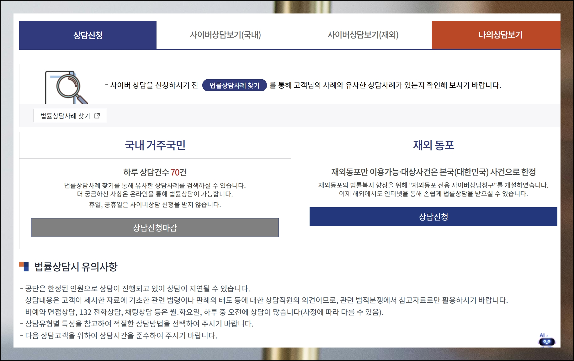 사이버 상담 메뉴를 선택해서 들어가보세요. 신청 버튼을 누르면 질문을 입력할 수 있는 창이 나타나요. 하루 접수 건수는 70건으로 제한되어 있으니 참고해 주세요. 신청하기 전에 사례 찾기 기능을 먼저 이용해보세요. 본인과 비슷한 상황의 사례가 이미 있는지 확인할 수 있거든요.