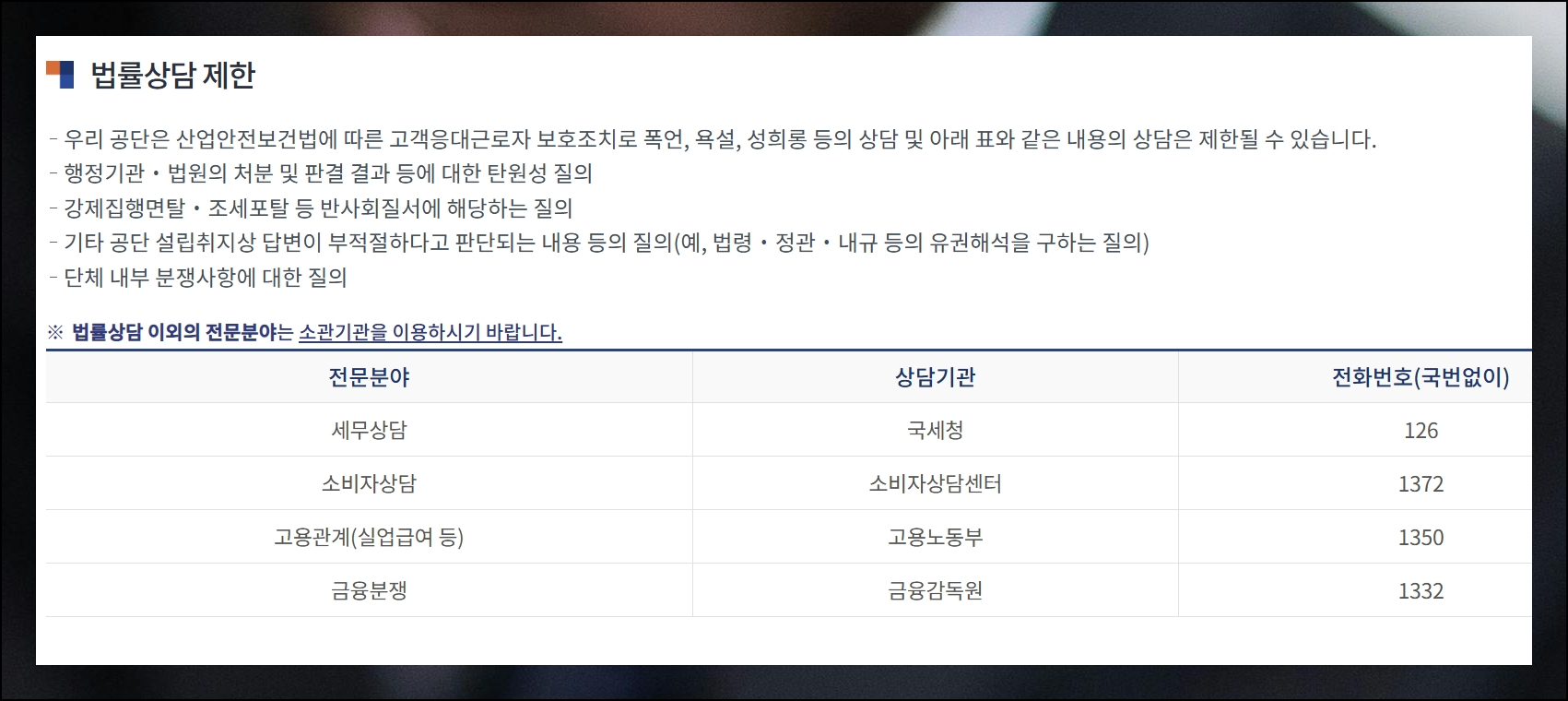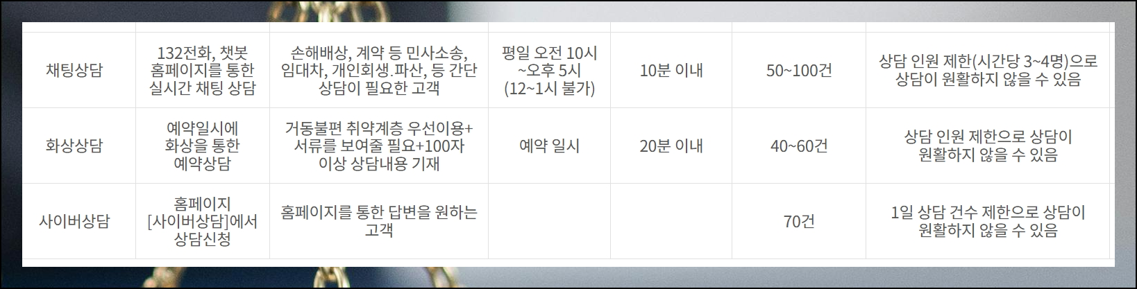 새로 열린 페이지에서 상담 안내 메뉴를 찾아 클릭해보세요. 화면에는 모든 방식이 표시됩니다. 전화번호를 누르는 통화 방식, 온라인 사이버, 직접 방문, 실시간 화상 서비스이에요. 모두 무료로 이용할 수 있지만, 통화의 경우 통화료가 발생합니다. 방문이나 화상 상담을 원한다면 해당 페이지에서 미리 예약을 진행해야 하는 것도 기억해 주세요.
