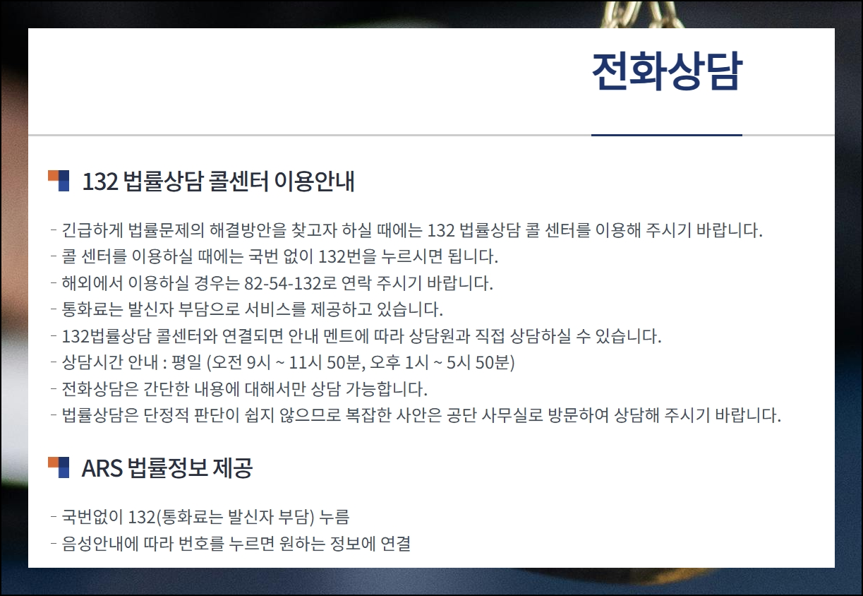 법률 문제로 고민이 많으신가요? 132번 전화번호를 누르면 바로 법적인 문제에 대하여 도움을 주는 콜센터에 연결됩니다. 해외 거주자라면 전화번호가 달라요. "82-54-132" 이렇게 해외통화를 할때와 같은 방식으로 전화번호를 눌러야 해요. 통화를 시작하면 자동 음성이 나오거나 담당자가 직접 응답해요. 복잡한 절차 없이 음성 안내를 따라가면 법률상담이 시작되니까 부담 갖지 마세요.