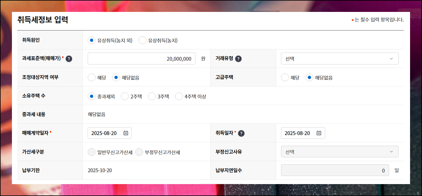 계산 도구 입력창에 관련 데이터를 기재해주세요. 2천 만원 상당의 주택을 유상 취득하는 경우를 예시로 취등록세를 계산해보겠어요. 정확한 정보 입력이 정밀한 산출 결과로 이어집니다.