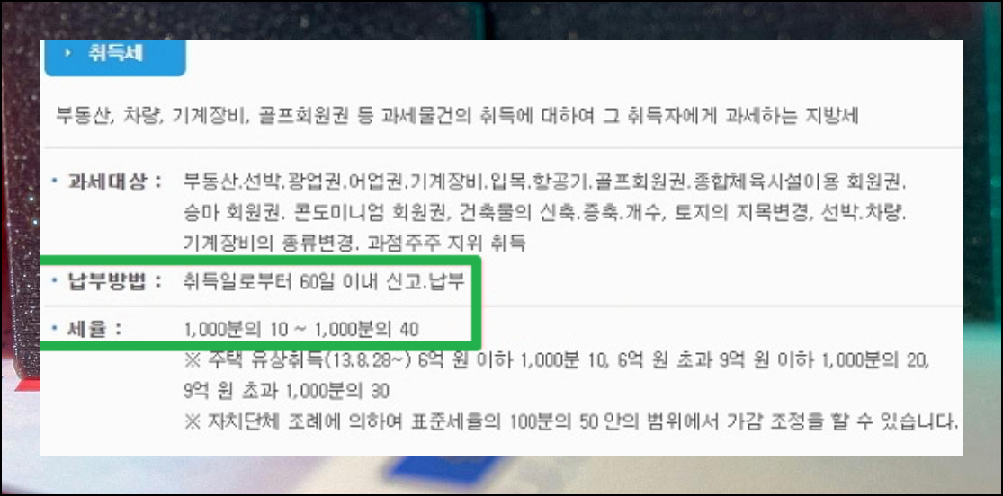 취득세 관련 상세 설명이 나타나요. 과세 범위와 납부 절차, 세율 정보를 꼼꼼히 확인하세요. 계산기 이용 전에 필수로 알아둬야 할 핵심 내용입니다.