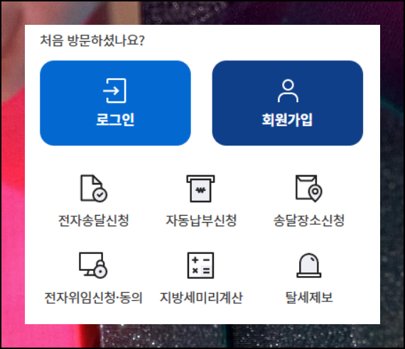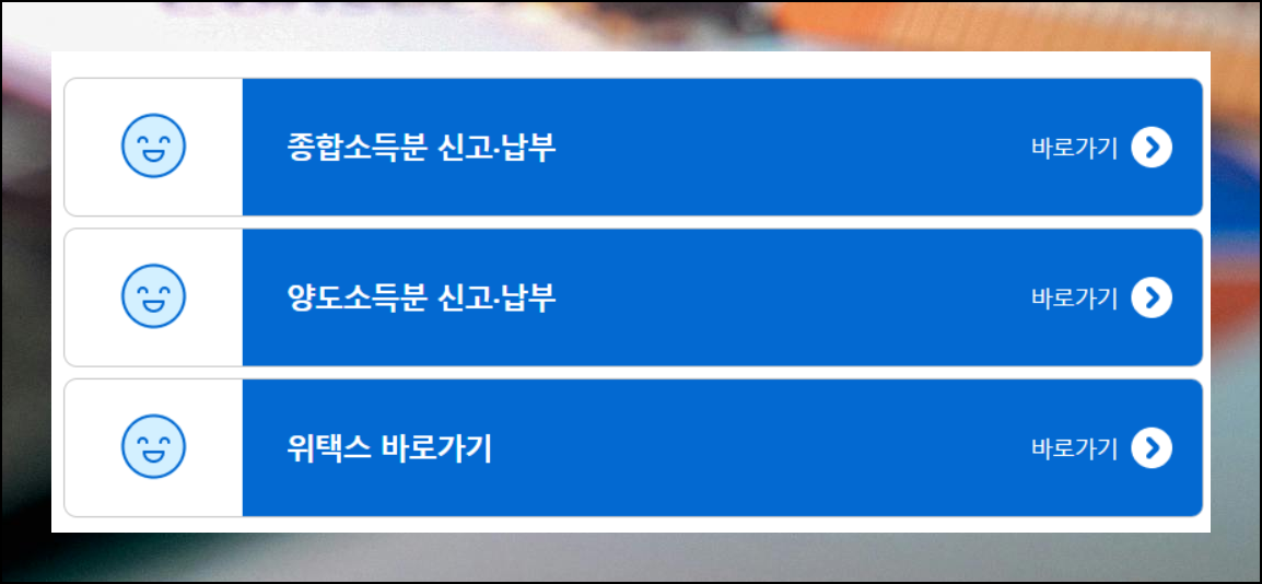 취등록세는 지방세 항목에 해당하므로 위텍스 포털에서 확인해야 해요. 이 사이트는 지방세 관련 모든 업무를 통합 처리하는 플랫폼입니다. 세금 신고 시기이므로 메인 화면의 바로가기 버튼 세 번째를 선택하면 빠르게 접근할 수 있어요.