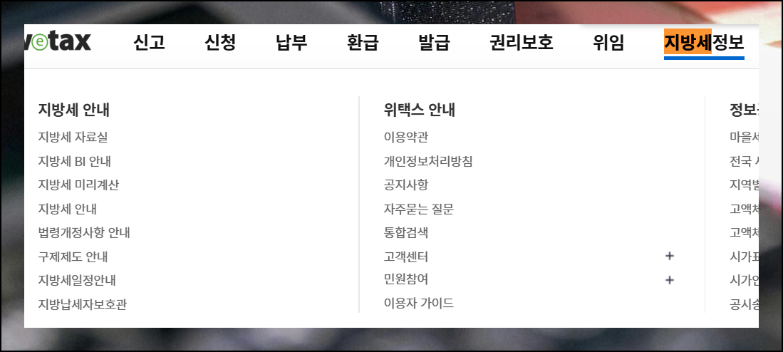 위텍스는 다양한 서비스를 제공하기 때문에 취등록세 계산기를 바로 찾기 어려울 수 있어요. 지방세 정보 영역의 지방세안내 메뉴로 이동해주세요. 체계적인 메뉴 구성으로 되어 있어 단계별로 접근하면 어렵지 않습니다.