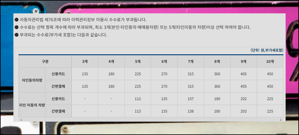 차량 조회에 필요한 금액은 매우 저렴해요. 다른 사람 소유 자동차 확인은 3회에 135원만 지불하면 됩니다. 이 정도 적은 돈으로 핵심 정보를 살펴볼 수 있다니 경제적이죠. 번호판으로 검색할 때 횟수별 요금은 안내표를 보시면 되어요.